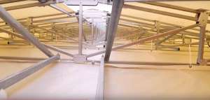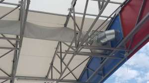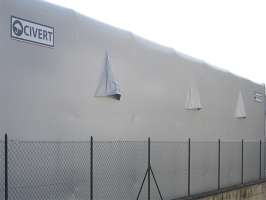 Il telo di copertura è interrotto in prossimità del colmo e l'apertura ricavata viene coperta con la posa di una struttura di rialzo che sostiene profili sui quali viene assicurato un telo di larghezza maggiore per evitare infiltrazioni in caso di precipitazioni atmosferiche. La luce aperta è libera pertanto eventuali reti anti uccello dovranno essere posate a cura del cliente qualora ce ne fosse la necessità.