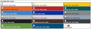 Di seguito la tabella colori disponibile sulle porte rapide con telo standard e con telo coibentato (disponibile solo in 6 tinte).